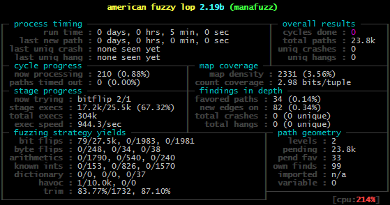 afl-fuzz -m500 -i input/ -o output/ -t100 -- manafuzz @@
